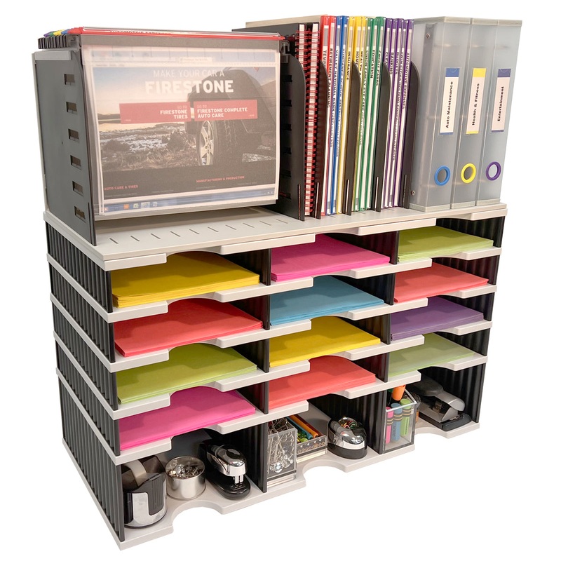 FeaturesEVERYTHING YOU NEED IN ONE COMPACT, MODULAR SYSTEM - Overall unit measures just 28 1/2"w x 26 3/4"h x 13"d. Combines 12 letter tray compartments PLUS a Riser Storage Base, and a Vertical / Hanging File into one compact organizer. Letter Tray Compar