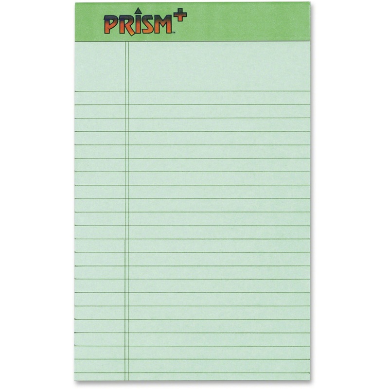 Brighten the office with soft colored papers and bindings to match. Colors are easy on the eyes and help organize projects. Prism Plus Pads also offer a rigid, 56 point, chipboard backer that acts like a clipboard, providing excellent writing stability. Easy-tear, Letr-Trim perforations allow sheets to be removed easily. Each pad contains 50 ruled sheets of 16 lb. paper. Each junior legal-ruled sheet has 9/32″ line spacings and a 1″ left margin.