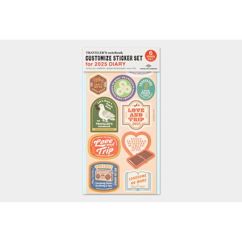 This is a sticker set for decorating and customizing your TRAVELER’S notebook. The sticker set includes six sticker sheets that feature index stickers, pocket stickers, icon stickers, clear round stickers, film pocket stickers, and schedulestickers.TRAVELER’S 2025 theme is LOVE AND TRIP and it is inspired by the love and deep personal connection each TRAVELER’S user has poured into their own TRAVELER’S Notebook. When two TN users meet each other, a special bond occurs when they share their TNs with each other. The 2025 theme encourages TN users to consider the possibility of a world of TRAVELER’S Notebook users, where everyone could share something so deeply personal with another and envision the world of greater peace and tranquility that could result.