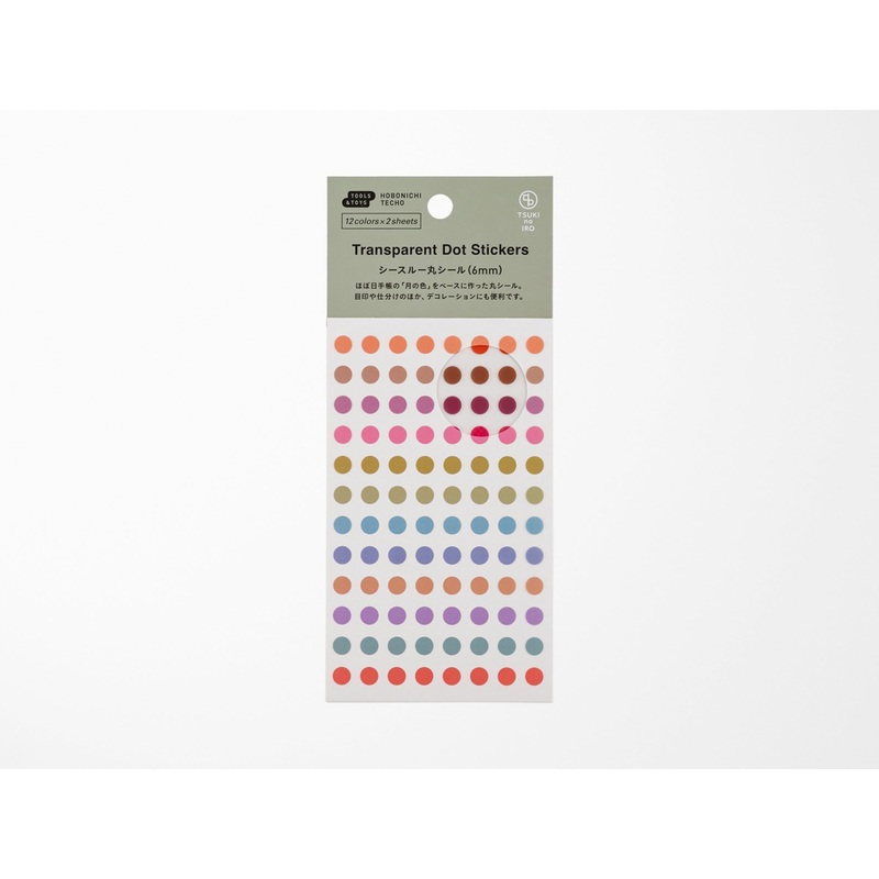 The Hobonichi Techo uses 12 soft colors across the book. The TSUKI no IRO stationery series incorporates these colors into simple designs. Clear round stickers made from durable PET material. The 6mm stickers comes as a set of two sheets, with 16 stickers of each color, for a total of 192 stickers. Theyre great for highlighting important items, organizing, or decorating.