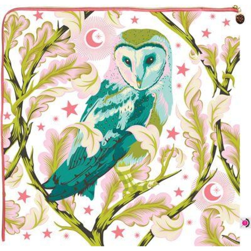 Tula Pink Night Owl XL CornerZip Bag. The Tula Pink Night Owl XL Corner Zip Bag is a new size bag that measures at 20in x 20in with a corner zipper on the top and side.
