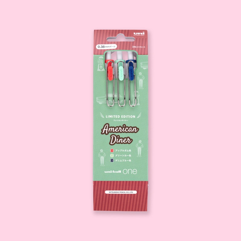 A set of three colors, which are matched to look like the interior of a bistro (restaurant) or car of the time, as seen in American movies of the 80s and 90s.The packaging for this pen set has diagonal cuts at the top and bottom, and the packaging is desig