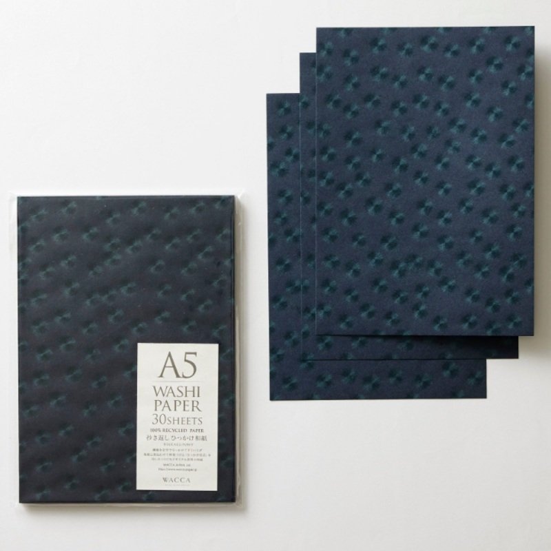 Made from 100% recycled washi paper re-spun from factory stock, it is dyed dark blue to ensure even coloring. Dark-colored hook washi paper is rare and hard to find. For best results, use white, silver, or gold pigment inks or gel pens.