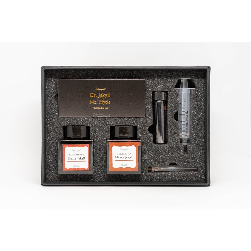 “Jekyll to Hyde” is a two-colour ink set that captures the twopersonalities of this famous literary character. “Henry Jekyll” is a deep crimson red ink, while “Edward Hyde” is a rich dark purple with stunning green sheen. Each set comes with an extra bottle of “conversion solution” and a refill syringe for you to experiment with mixing the two inks to create your own custom “Mr. Hyde” shade