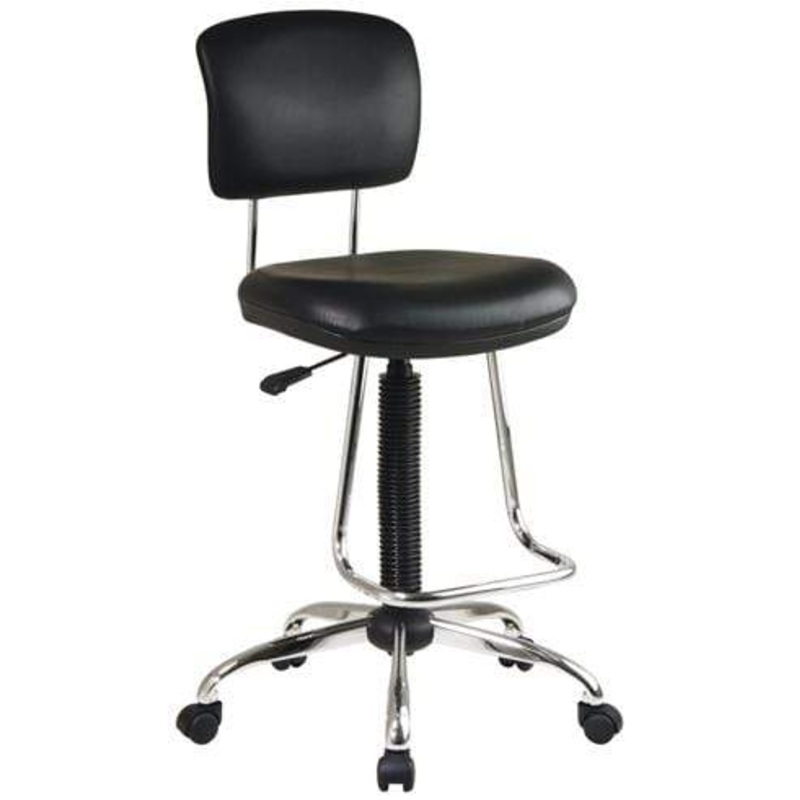 A vinyl seating surface for easy cleaning and a classic chrome finish for timeless style!This affordable drafting chair is designed for both comfort and functionality, featuring an intuitive one-touch pneumatic mechanism that allows for effortless seat hei