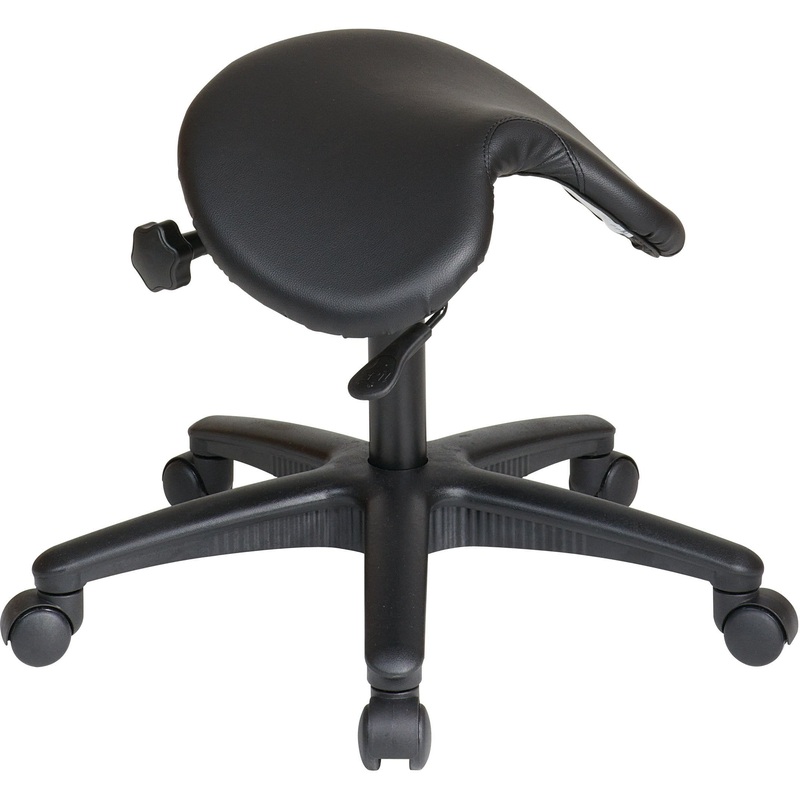 Overstock Special!Features: Thickly padded saddle seat in black vinylAdjustable seat anglePneumatic seat height adjustmentHeavy duty nylon base with dual wheel carpet casters for mobilityOptional soft wheel casters or stationary floor glides also available