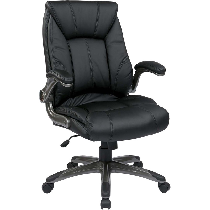 Features:Thick Padded Contour Faux Leather Seat and Back with Built-in Lumbar SupportOne Touch Pneumatic Seat Height AdjustmentLocking Tilt Control with Adjustable Tilt Tension Padded Flip Arms Black Faux Leather Heavy Duty Titanium Coated Base with Black