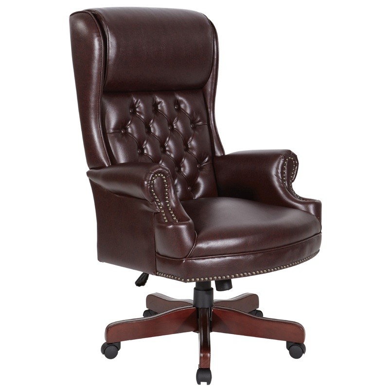 This high-back executive chair boasts a classic British design with a traditional Queen Ann style. It is generously sized and durably made, with a hint of classic wingback style but minimal flanking for a more modern feel. This design allows for a wider range of motion when sitting, reading, or typing emails. The chair is intelligently constructed with a one-touch pressurized seat height adjustment, locking tilt control, adjustable tilt tension, and oversized wheel carpet casters. These features allow for custom modifications for ergonomic considerations when working at a desk. The chair is constructed with high-quality and thickly padded headrest, back, seat, and armrests, making it comfortable to sit in for extended periods of time.
