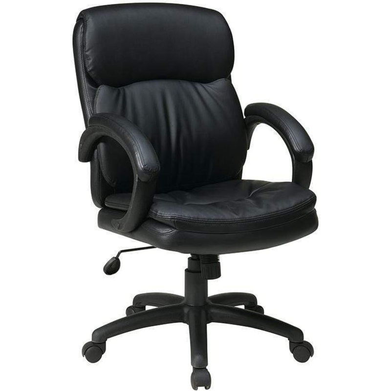 This mid-back executive office chair from Office Star features black Eco Leather upholstery. Eco Leather is comprised of a faux leather finished surface area with recycled leather backing, making it more durable than traditional vinyl backed with cotton.