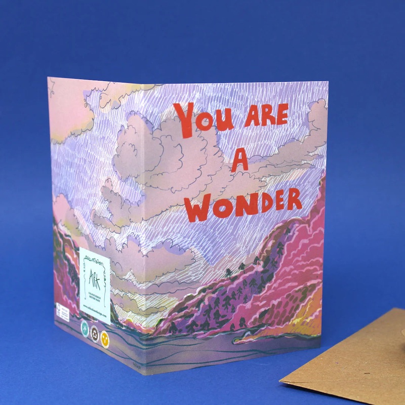 // Blank inside for a personal message. // British made litho printed card and printed using vegan friendly inks onto FSC card // Includes a kraft envelope // Designed in Cambridge // A6 size