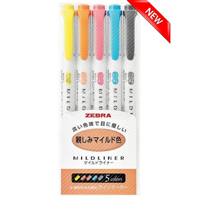 Mild Apricot, Mild Coral Pink, Mild Yellow, Mild Smoked Blue, and Mild Dark Grey.A brand new set of stunning mild highlighters from the Zebra, the company who created and defined this category.Featuring softly coloured ink, the Zebra Mildliner is perfect f