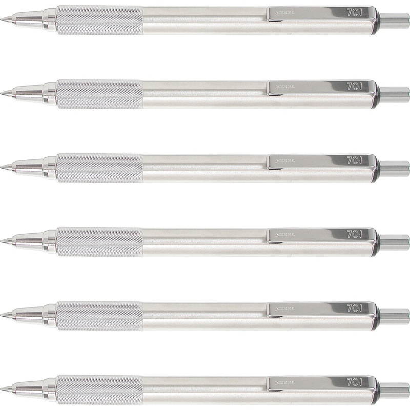 F-701 Retractable Ballpoint Pen is made of professional-grade stainless steel from tip to clip. It is designed to prevent corrosion. Easy-to-hold knurled metal grip provides writing stability. Quiet plunger mechanism silences any clicking when you retract. Pen with black ink is refillable with Zebra F-Refill.