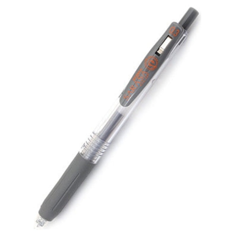 Zebra Sarasa Clip Gel 0.3mm Grey Rollerball PenThe Zebra Sarasa Push Clip gel pen is the pinnacle of modern gel pen architecture. A well designed body with a comforable rubber grip, a sturdy retractable 3.0mm tip and an oversized, large spring cllp that at
