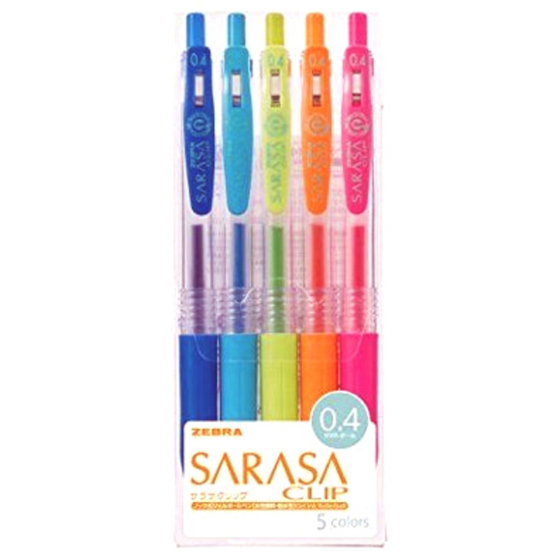 Zebra Sarasa Clip Gel 0.4 Rollerball Pen SetCobalt Blue, Light Blue, Light Green, Orange, PinkThe Zebra Sarasa Push Clip gel pen is the pinnacle of modern gel pen architecture. A well designed body with a comforable rubber grip, a sturdy retractable 3.0mm