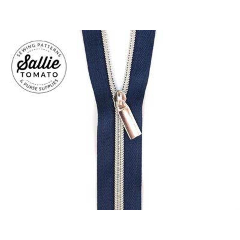 Zipper by The Yard-Navy/Nickel. Sallie Tomato #5 Zippers by the Yard contain three yards of zipper tape and 9 pulls. Coordinate the zipper tape color with your fabric and match the zipper teeth color with your purse hardware! Easily cut and sew through the nylon teeth while achieving the appearance of metal teeth. Designed by Sallie Tomato