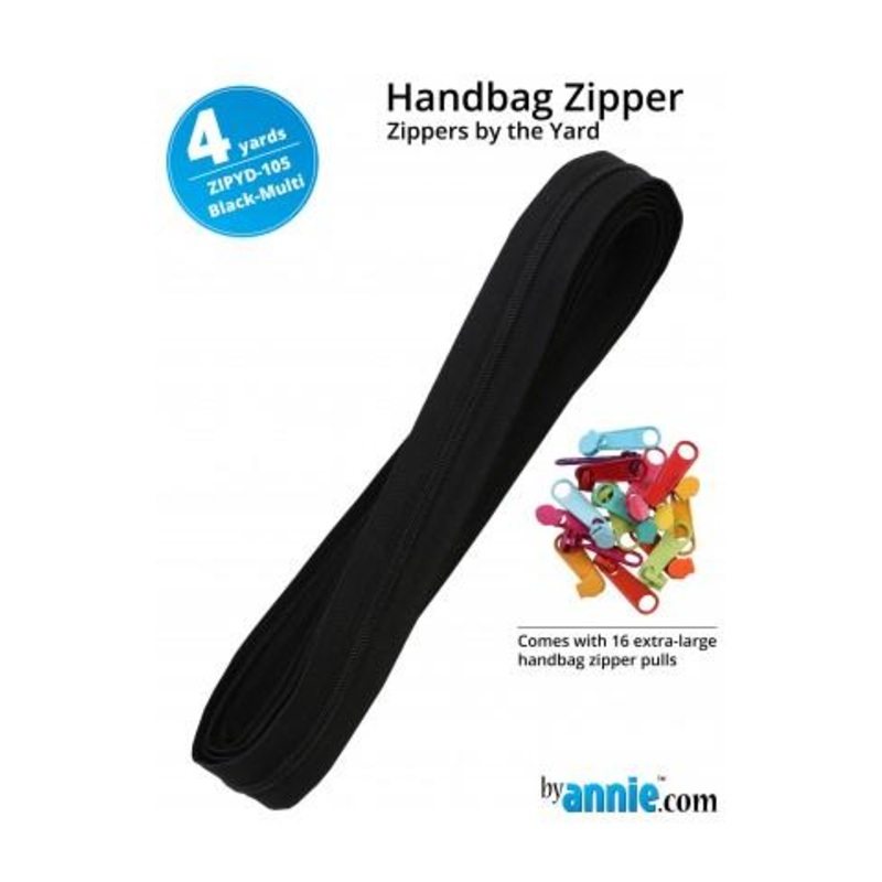 Zippers by The Yard-Black Multi. Zippers by the Yard contain 4 yards of zipper chain and 16 color-coordinated extra-large pulls.* This packaging enables you to make single-slide or double-slide zippers of any length (up to 144″) with little waste, saving money and time. Here’s why we prefer these zippers: Dress and skirt zippers carried by most stores are too small. The #4.5 size is just the right size for purses, bags and totes. The wide zipper tape makes insertion easy. Unlike zippers with chunky, molded polyester teeth, these handbag zippers are soft and flexible, making them easy to sew through. (No more broken needles!) The nylon coil is strong and durable zip after zip. These zippers are available in 32 colors to help you find just the right color for your project.